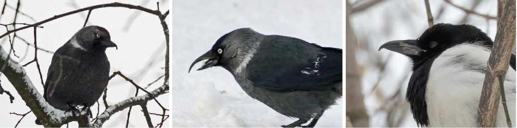 Рис. 26 (в центре). Галка Corvus monedula c аномалией клюва. Киров. 17 февраля 2025. Фото А.В.Козловой.