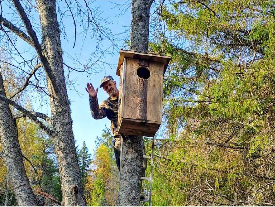 Рис. 6. Развеска искусственных гнездовий для крохаля. Река Ишеть у села Прозорово, Советский район. 30 сентября 2023. Фото И.Д.Обухова