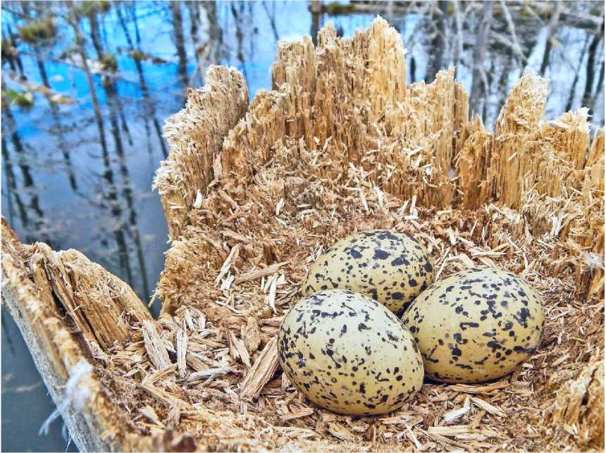 Большой крохаль Mergus merganser. До конца ХХ века большой крохаль считался в Кировской области редким пролётным видом, гнездящимся, вероятно, в северных районах (Плесский 1976; Сотников 1999). Выводки встречены всего несколько раз: в 1947 году в Орловском рай- оне, в 1996 – в Котельничском, в 2021 – в Оричевском (Сотников и др. 2021, 2024). Ни одного гнезда на территории области не найдено. На речке Ишеть у села Прозорово в Советском районе (южная часть области) 1 июня 2022 была встречена самка с 8 птенцами в возрасте 1-2 сут. В сентябре 2023 года на берегу этой речки мы развесили 2 гнездовых ящика (рис. 6). В 2024 году они нами не проверялись, а 2 мая 2025 при их осмотре в одном обнаружили самку большого крохаля, насиживающую 19 яиц! В 300 м от этого места на речке держалась вторая самка с самцом. Все яйца были взвешены и измерены, оценена их окраска и форма. Оказалось, что в это гнездо неслись две самки; одна отложила 11 яиц, другая – 8.