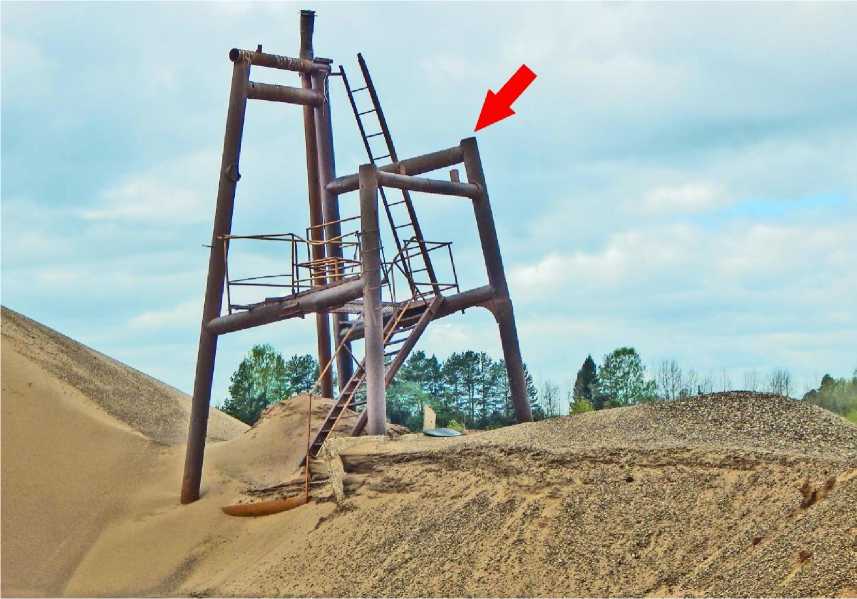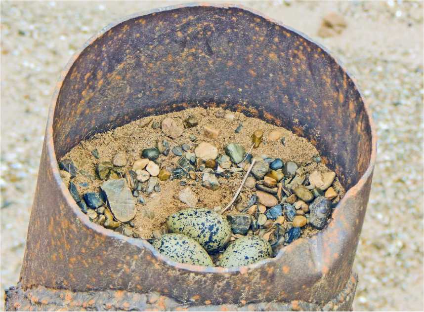 Рис. 10. Гнездо кулика-сороки Haematopus ostralegus на вершине металлической трубы. Песчаный карьер в пойме Вятки у посёлка Мурыгино. 22 мая 2025. Фото В.Н.Сотникова