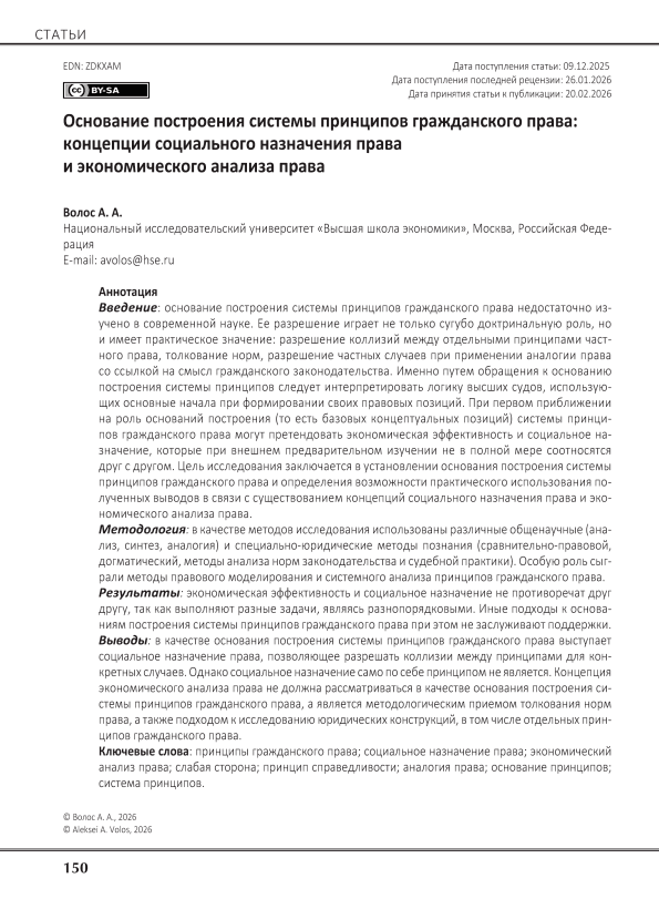 Introduction: the basis for building a system of principles of civil law is insufficiently studied in modern science. Its resolution plays not only a purely doctrinal role, but also has practical significance: resolving conflicts between individual principles of private law, interpreting norms, resolving special cases when applying the analogy of law with reference to the meaning of civil legislation. It is by referring to the basis for building a system of principles that the logic of the supreme courts should be interpreted, using the basic principles in forming their legal positions. At a first approximation, economic efficiency and social purpose, which do not fully correlate with each other during external preliminary study, can claim to be the foundations for building (that is, the basic conceptual positions) of the system of principles of civil law. The purpose of the study is to establish the basis for building a system of principles of civil law and to determine the possibility of practical use of the findings in connection with the existence of concepts of social purpose of law and economic analysis of law. Methodology: various general scientific (analysis, synthesis, analogy) and special legal methods of cognition (comparative legal, dogmatic, methods of analysis of legislation and judicial practice) are used as research methods. A special role was played by the methods of legal modeling and system analysis of the principles of civil law. Results: economic efficiency and social purpose do not contradict each other, as they perform different tasks, being of different orders. Other approaches to the foundations of building a system of principles of civil law do not deserve support. Conclusions: the basis for building a system of principles of civil law is the social purpose of law, which allows resolving conflicts between principles for specific cases. However, social purpose is not a principle in itself. The concept of economic analysis of law should not be considered as the basis for building a system of principles of civil law, but is a methodological technique for interpreting legal norms, as well as an approach to the study of legal structures, including individual principles of civil law.