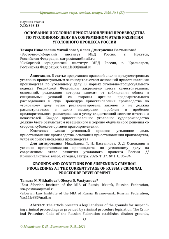 Grounds and conditions for suspending criminal proceedings at the current stage of Russia’s criminal procedure development