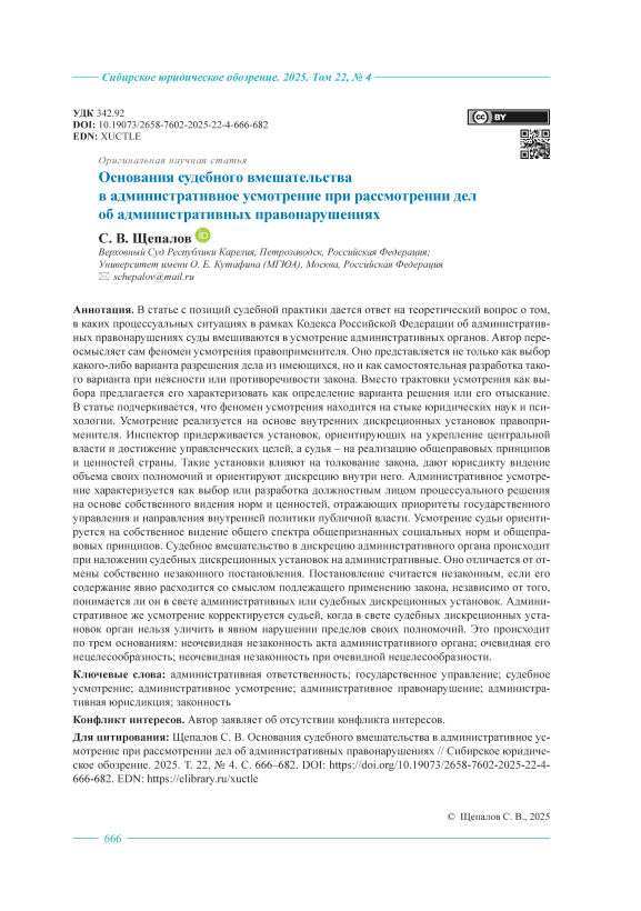 В статье с позиций судебной практики дается ответ на теоретический вопрос о том, в каких процессуальных ситуациях в рамках Кодекса Российской Федерации об административных правонарушениях суды вмешиваются в усмотрение административных органов. Автор переосмысляет сам феномен усмотрения правоприменителя. Оно представляется не только как выбор какого-либо варианта разрешения дела из имеющихся, но и как самостоятельная разработка такого варианта при неясности или противоречивости закона. Вместо трактовки усмотрения как выбора предлагается его характеризовать как определение варианта решения или его отыскание. В статье подчеркивается, что феномен усмотрения находится на стыке юридических наук и психологии. Усмотрение реализуется на основе внутренних дискреционных установок правоприменителя. Инспектор придерживается установок, ориентирующих на укрепление центральной власти и достижение управленческих целей, а судья – на реализацию общеправовых принципов и ценностей страны. Такие установки влияют на толкование закона, дают юрисдикту видение объема своих полномочий и ориентируют дискрецию внутри него. Административное усмотрение характеризуется как выбор или разработка должностным лицом процессуального решения на основе собственного видения норм и ценностей, отражающих приоритеты государственного управления и направления внутренней политики публичной власти. Усмотрение судьи ориентируется на собственное видение общего спектра общепризнанных социальных норм и общеправовых принципов. Судебное вмешательство в дискрецию административного органа происходит при наложении судебных дискреционных установок на административные. Оно отличается от отмены собственно незаконного постановления. Постановление считается незаконным, если его содержание явно расходится со смыслом подлежащего применению закона, независимо от того, понимается ли он в свете административных или судебных дискреционных установок. Административное же усмотрение корректируется судьей, когда в свете судебных дискреционных установок орган нельзя уличить в явном нарушении пределов своих полномочий. Это происходит по трем основаниям: неочевидная незаконность акта административного органа; очевидная его нецелесообразность; неочевидная незаконность при очевидной нецелесообразности.
