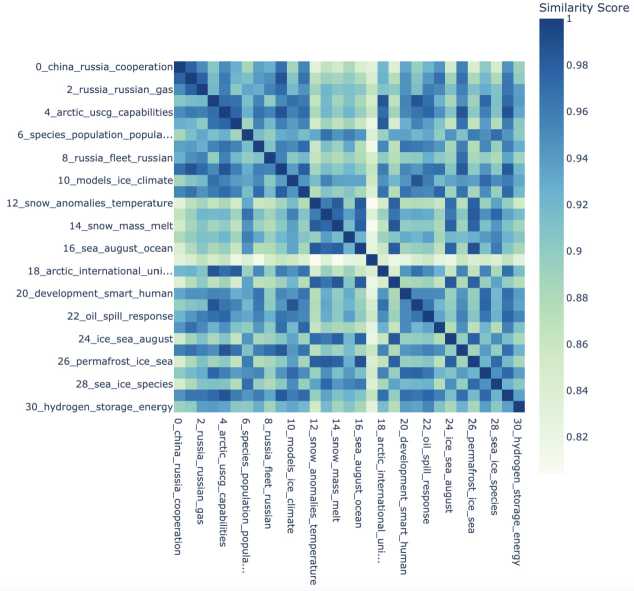 Низкое сходство между темами “30; hydrogen; storage; energy” («30; водород; хранение; энергия») и “6; species; population; popular” («6; виды; популяция; популярный») свидетельствует о независимости вопросов энергетических технологий и сохранения биоразнообразия в арктической политике. Связь исследования водородного хранения как технологии будущего и экологии, в частности изучения популяций видов, ограничена. Низкое сходство темы “4; arctic; uscg; capability” («4; арктика; сшапбо14; возможность») с другими экологическими и энергетическими темами может объясняться тем, что первая больше ориентирована на действия Береговой охраны США в Арктике и характеризуется как конкретная и техническая в отличие от более широких вопросов, касающихся экологии или международного сотрудничества.