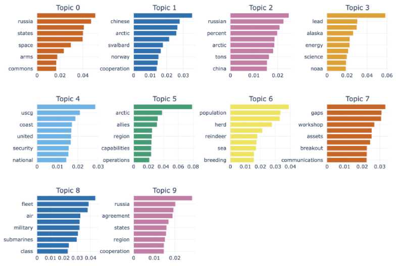 Сходство тем “24; ice; sea; august” («24; лед; море; август») и “26; permafrost; ice; sea” («26; вечнаямерзлота; лед; море») может указывать на внимание к изменениям ледового покрова и многолетней мерзлоты, ключевым для стратегических интересов США, разработки ресурсов и охраны экологии в регионе.