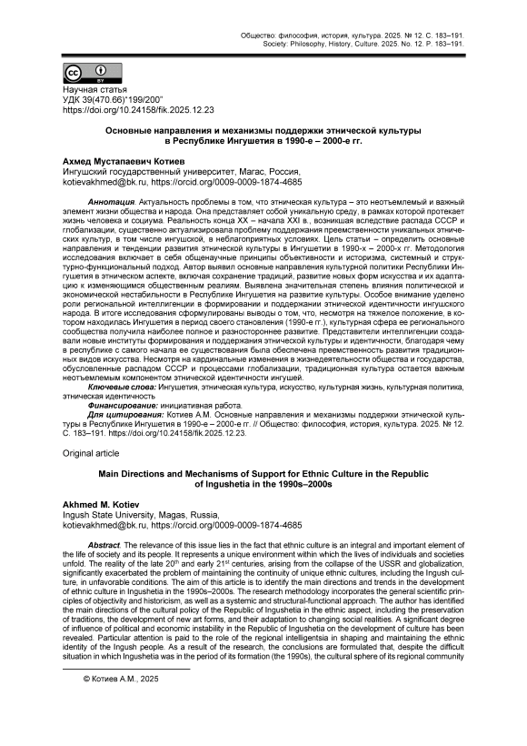 Актуальность проблемы в том, что этническая культура – это неотъемлемый и важный элемент жизни общества и народа. Она представляет собой уникальную среду, в рамках которой протекает жизнь человека и социума. Реальность конца XX – начала ХХI в., возникшая вследствие распада СССР и глобализации, существенно актуализировала проблему поддержания преемственности уникальных этнических культур, в том числе ингушской, в неблагоприятных условиях. Цель статьи – определить основные направления и тенденции развития этнической культуры в Ингушетии в 1990-х – 2000-х гг. Методология исследования включает в себя общенаучные принципы объективности и историзма, системный и структурно-функциональный подход. Автор выявил основные направления культурной политики Республики Ингушетия в этническом аспекте, включая сохранение традиций, развитие новых форм искусства и их адаптацию к изменяющимся общественным реалиям. Выявлена значительная степень влияния политической и экономической нестабильности в Республике Ингушетия на развитие культуры. Особое внимание уделено роли региональной интеллигенции в формировании и поддержании этнической идентичности ингушского народа. В итоге исследования сформулированы выводы о том, что, несмотря на тяжелое положение, в котором находилась Ингушетия в период своего становления (1990-е гг.), культурная сфера ее регионального сообщества получила наиболее полное и разностороннее развитие. Представители интеллигенции создавали новые институты формирования и поддержания этнической культуры и идентичности, благодаря чему в республике с самого начала ее существования была обеспечена преемственность развития традиционных видов искусства. Несмотря на кардинальные изменения в жизнедеятельности общества и государства, обусловленные распадом СССР и процессами глобализации, традиционная культура остается важным неотъемлемым компонентом этнической идентичности ингушей.