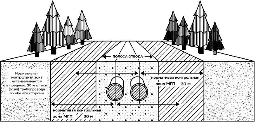 Для исключения возможности повреждения трубопроводов (при любом виде их прокладки) устанавливаются охранные зоны шириной от 25 м вдоль трасс трубопроводов, транспортирующих нефть, природный газ, нефтепродукты, нефтяной и искусственный углеводородные газы, в виде участка земли, ограниченного условными линиями от оси трубопровода с каждой стороны, до 100 м вокруг технологических установок подготовки продукции к транспорту, перекачке, компрессорных и газораспределительных станций, станций подземного хранения газа. Участки земли, входящие в охранные зоны подземных трубопроводов, не изымаются у землепользователей и используются ими для проведения сельскохозяйственных и иных работ с обязательным соблюдением требований «Правил охраны магистральных трубопроводов» [1], однако в охранных зонах магистральных трубопроводов запрещается застройка и всякого рода действия, способные нарушить нормальную эксплуатацию трубопроводов, либо привести к их повреждению.