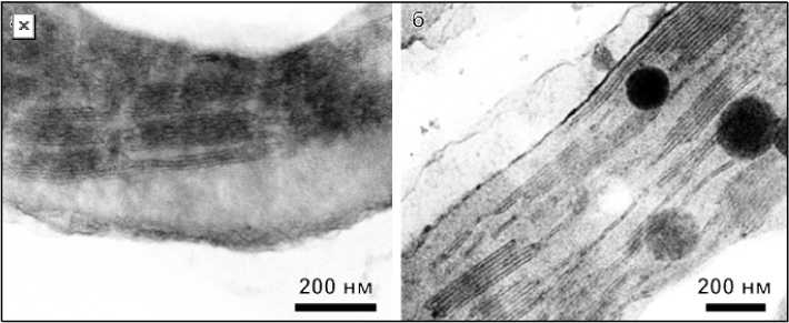 Fig. 1. Photographs of the chloroplast structure of rapeseed leaves that did not receive ( a ) and received ( б ) the addition