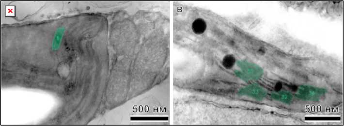 Изображения структуры хлоропластов на ультратонких срезах получали с помощью просвечивающего электронного микроскопа Hitachi HT7700. Анализ проводился при ускоряющем напряжении 90 кВ в режиме светлого поля. Для получения репрезентативных данных о пространственной организации тилакоидных мембран проводилась серийная съемка при различных ориентациях образца.