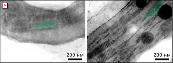 Рис. 2. Снимки структуры хлоропластов листьев рапса после обработки с помощью GRANA, не получавшие ( а , б ) и получавшие добавку ( в , г )