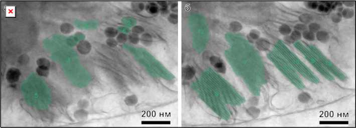 Fig. 3. Images of the chloroplast structure of higher plant leaves after processing using GRANA at an observation angle of 30° to the grana ( a ) and at a right angle ( б )