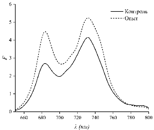 2. Обнаружено сужение полуширины пика флуоресценции фотосистемы II в опытном образце по сравнению с контрольным, что свидетельствует о повышении эффективности миграции энергии возбуждения.
