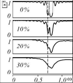 Fig. 5. Averaged transmission spectra of a PC grating with variable layer thickness depending on the maximum amplitude of random deviations of linear dimensions from the initially specified ones [20]