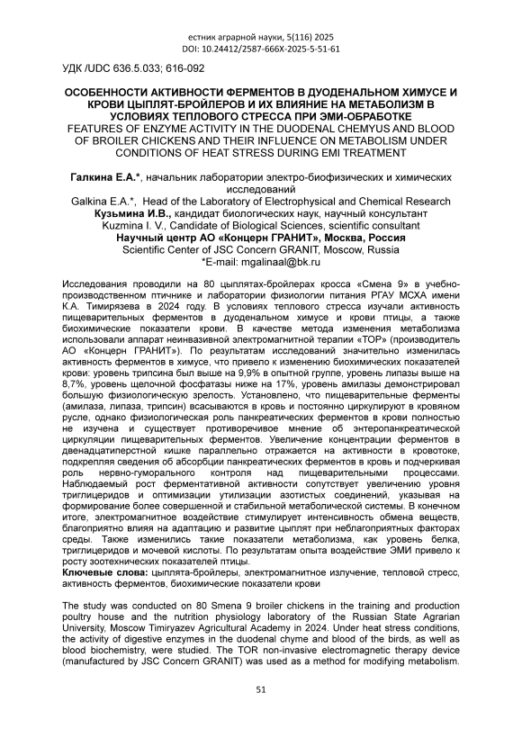 Исследования проводили на 80 цыплятах-бройлерах кросса «Смена 9» в учебно- производственном птичнике и лаборатории физиологии питания РГАУ МСХА имени К.А. Тимирязева в 2024 году. В условиях теплового стресса изучали активность пищеварительных ферментов в дуоденальном химусе и крови птицы, а также биохимические показатели крови. В качестве метода изменения метаболизма использовали аппарат неинвазивной электромагнитной терапии «ТОР» (производитель АО «Концерн ГРАНИТ»). По результатам исследований значительно изменилась активность ферментов в химусе, что привело к изменению биохимических показателей крови: уровень трипсина был выше на 9,9% в опытной группе, уровень липазы выше на 8,7%, уровень щелочной фосфатазы ниже на 17%, уровень амилазы демонстрировал большую физиологическую зрелость. Установлено, что пищеварительные ферменты (амилаза, липаза, трипсин) всасываются в кровь и постоянно циркулируют в кровяном русле, однако физиологическая роль панкреатических ферментов в крови полностью не изучена и существует противоречивое мнение об энтеропанкреатической циркуляции пищеварительных ферментов. Увеличение концентрации ферментов в двенадцатиперстной кишке параллельно отражается на активности в кровотоке, подкрепляя сведения об абсорбции панкреатических ферментов в кровь и подчеркивая роль нервно-гуморального контроля над пищеварительными процессами. Наблюдаемый рост ферментативной активности сопутствует увеличению уровня триглицеридов и оптимизации утилизации азотистых соединений, указывая на формирование более совершенной и стабильной метаболической системы. В конечном итоге, электромагнитное воздействие стимулирует интенсивность обмена веществ, благоприятно влияя на адаптацию и развитие цыплят при неблагоприятных факторах среды. Также изменились такие показатели метаболизма, как уровень белка, триглицеридов и мочевой кислоты. По результатам опыта воздействие ЭМИ привело к росту зоотехнических показателей птицы.