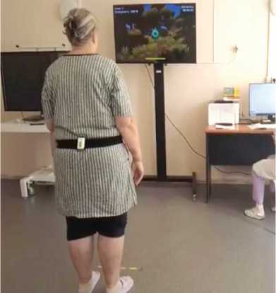 Исследование проведено с января по июнь 2025 г. в стационарном отделении медицинской реабилитации Ивановского областного госпиталя для ветеранов войн. Использована технология инерциальных сенсоров (сенсор «Нейросенс» ООО «Нейрософт», г. Иваново, Россия) с программным обеспечением «Стэдис – Баланс» (№ РЗН 2018/7458 от 11.07.2022). Сенсор устанавливали в область проекции LIV–L V (рис. 1), в реальный центр масс тела человека. Обследования проводили в лаборатории «Биомеханика» в одно и то же время при комфортной температуре при поступлении пациента в отделение и при выписке. Переходные процессы отслеживали предварительным мониторингом без регистрации в течение 1–2 мин, затем проводили регистрацию по 30 сек. с открытыми и закрытыми глазами (тест Ромберга). При необходимости опору осуществляли в виде разгрузки симметрично, центрально (ходунки с фиксацией тормоза потребовались двум пациентам).
