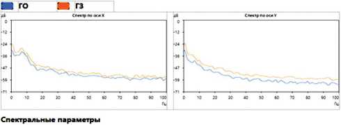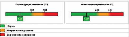 Автоматический протокол (рис. 2) формировался сразу после обследования, фиксировались угловые отклонения сенсора в пояснично-крестцовом отделе позвоночника во фронтальной и сагиттальной плоскостях (среднее отклонение и дисперсия в градусах от вертикали; скорость; площадь; длина колебаний и их отношение к площади эллипса; коэффициент Ромберга как отношение площади при за- крытых и открытых глазах). Спектральные показатели представлялись как превалирующая частота и 60 % мощности частоты колебаний по осям. Дополнительно в режиме эмуляции у пациентов проведена оценка ускорений колебаний БВС, позволяющая дополнительно вычленить колебания вверх-вниз во фронтальной плоскости, и выделены критериальные для степени напряжения компенсации показатели. В дополнение к стандартной Индивидуальной программе реабилитации всем пациентам в соответствии с клиническими рекомендациями был добавлен стабилотренинг с использованием механизма биологической обратной связи в игровой среде (от 7 до 20 мин № 10 ежедневно).