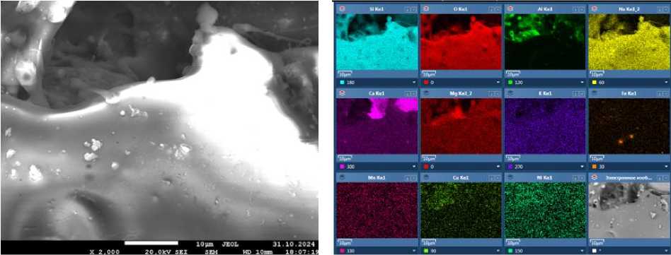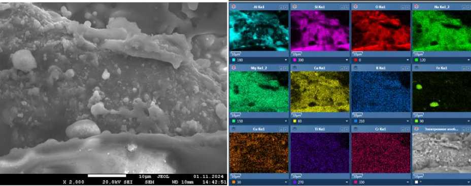 Наличие стекла в смеси порошков отразилось на среднем составе ТБП, сравнительно высокое содержание кальция, кремния, натрия демонстрируют доминирование областей стекла. Примесь железа, находящаяся в стекольном бое, различима на картах в отдельных каплях (рис. 9).