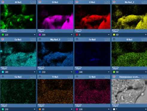 Из данных картирования можно сделать вывод о составе поверхности (табл. 6). Основу составляет алюминий, а количество примесей находится в пределах нормы (см. табл. 2).