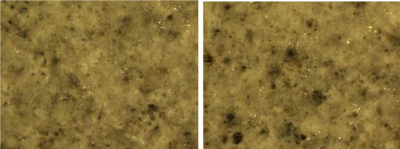 Образцы, на которые наносилось покрытие из чистого стекла, исследовались не на электронном, а на оптическом микроскопе, что дало информацию о цвете покрытия (рис. 12). На фотографиях длина большей стороны снимка составляет 3 мм. На изображениях видна блестящая оплавленная поверхность, большое количество закрытых пор и темные включения размером до 0,2 мм, вероятно, от случайных примесей в порошке стекла.