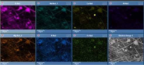 Рис.13. Морфология поверхности и карты распределения элементов в стеклянных нитях
