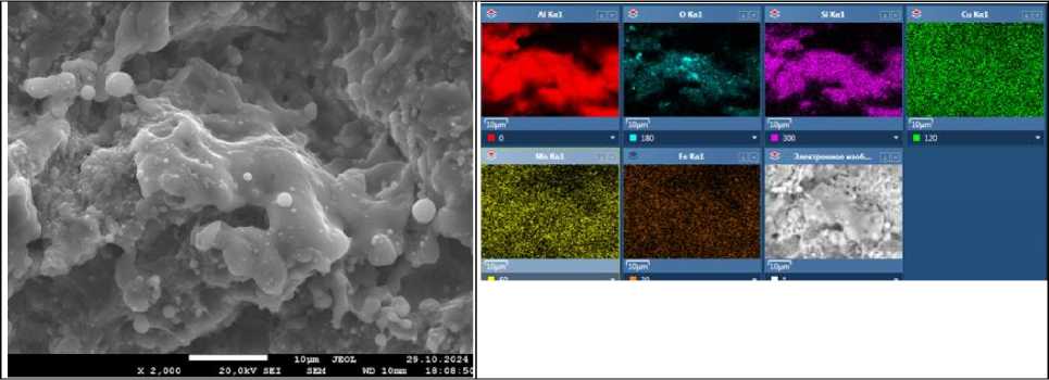 Рис. 9. Морфология поверхности и карты распределения элементов покрытия АК4-Стекло50(36)