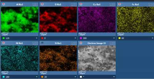 Из данных EDS картирования распределения элементов можно сделать вывод о составе поверхности, он представлен в табл. 5. Основную часть составляет алюминий, также присутствуют примеси, характерные для данного сплава (см. табл. 2).