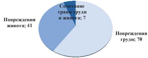 Из группы пациентов с повреждениями туловища (груди и живота), большую часть составили травмы груди, на долю которых пришлось 70 (59,4 %) случаев, травма живота диагностирована у 41 (34,7 %) пациента, сочетание травм груди и живота встретились у 7 (5,9 %) пациентов (рис. 2) В 50 % случаев имелись сочетанные повреждения (рис. 3).