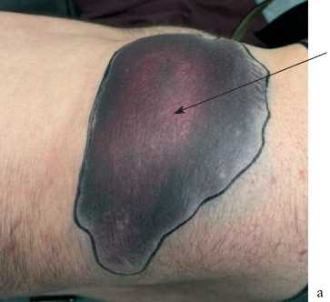 Из оперированных 17-ти пациентов с абдоминальной травмой. Первичная хирургическая обработка ран выполнена 5 (29,4 %) пострадавшим с открытыми повреждения- ми брюшной стенки. При ревизии раневого канала у всех пострадавших выявлен непроникающий характер ранения. В 1 (5,9 %) случае гематома брюшной стенки потребовала хирургического вмешательства – вскрытия гематомы, остановки кровотечения (рис. 4 а, б).