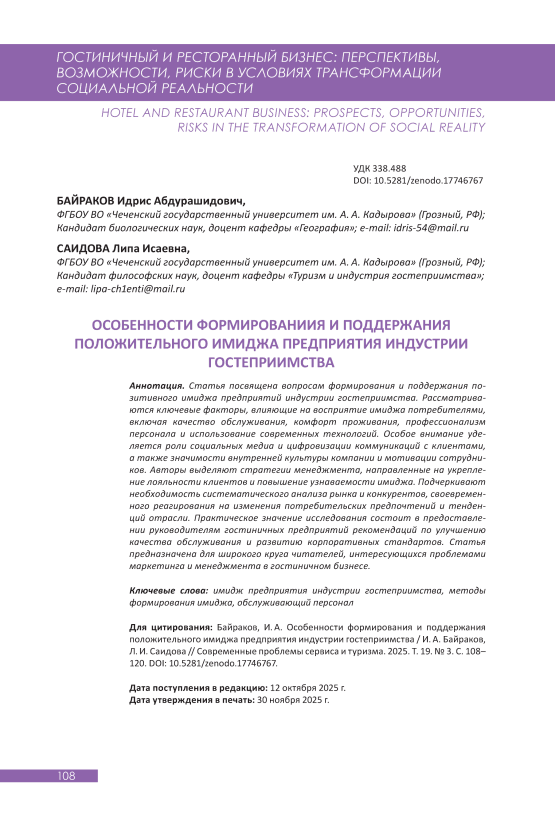 Статья посвящена вопросам формирования и поддержания позитивного имиджа предприятий индустрии гостеприимства. Рассматриваются ключевые факторы, влияющие на восприятие имиджа потребителями, включая качество обслуживания, комфорт проживания, профессионализм персонала и использование современных технологий. Особое внимание уделяется роли социальных медиа и цифровизации коммуникаций с клиентами, а также значимости внутренней культуры компании и мотивации сотрудников. Авторы выделяют стратегии менеджмента, направленные на укрепление лояльности клиентов и повышение узнаваемости имиджа. Подчеркивают необходимость систематического анализа рынка и конкурентов, своевременного реагирования на изменения потребительских предпочтений и тенденций отрасли. Практическое значение исследования состоит в предоставлении руководителям гостиничных предприятий рекомендаций по улучшению качества обслуживания и развитию корпоративных стандартов. Статья предназначена для широкого круга читателей, интересующихся проблемами маркетинга и менеджмента в гостиничном бизнесе.