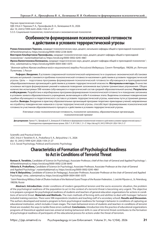 Введение. В условиях современной геополитической напряженности и социально-экономической обстановки весьма актуальной становится проблема психологической готовности населения к действиям в условиях террористической угрозы. Цель — подготовка программы формирования психологической готовности обучающихся и преподавателей общеобразовательных организаций к действиям в условиях террористической опасности. Материалы и методы. В качестве основных методов формирования умений и навыков поведения заложников выступили тренинговые упражнения. Общее количество испытуемых 598 человек (обучающиеся и педагогический состав средней образовательной школы). Результаты и обсуждение. Разработана и апробирована программа формирования психологической готовности к поведению заложника в условиях захвата образовательного учреждения, включающая в себя 4 основных этапа. Выделены основные поведенческие ошибки обучающихся и педагогического состава в условиях террористической угрозы, намечены пути устранения данных ошибок. Выводы. Внедрение в практику образовательных организаций программ теоретико-прикладных учений, направленных на отработку поведенческих навыков в случае террористической угрозы, способствует формированию психологической готовности участников образовательного процесса к действиям в условиях террористической угрозы.