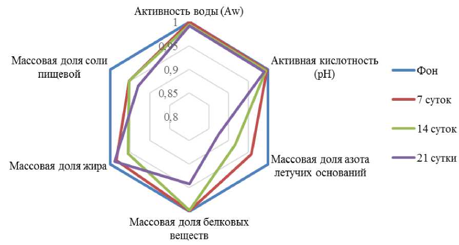 Анализ динамики выбранных показателей качества проводили графическим методом с помощью специально построенных лепестковых диаграмм (рис. 2–4). Для обеспечения сопоставимости показателей динамики каждого из изучаемых параметров исходную таблицу полученных данных нормализовали путем деления, полученного в процессе хранения значения, на его «фоновое» значение (1), то есть величину соответствующего параметра, характеризующего его значения у образца, закладываемого на хранение. Такую процедуру проводили для трех групп образцов: