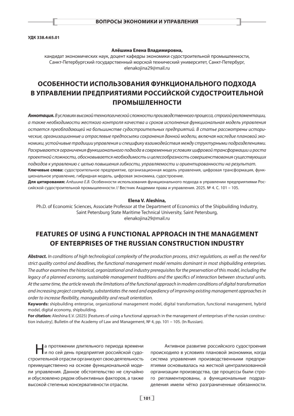 В условиях высокой технологической сложности производственного процесса, строгой регламентации, а также необходимости жесткого контроля качества и сроков исполнения функциональная модель управления остается преобладающей на большинстве судостроительных предприятий. В статье рассмотрены исторические, организационные и отраслевые предпосылки сохранения данной модели, включая наследие плановой экономики, устойчивые традиции управления и специфику взаимодействия между структурными подразделениями. Раскрываются ограничения функционального подхода в современных условиях цифровой трансформации и роста проектной сложности, обосновывается необходимость и целесообразность совершенствования существующих подходов к управлению с целью повышения гибкости, управляемости и ориентированности на результат.