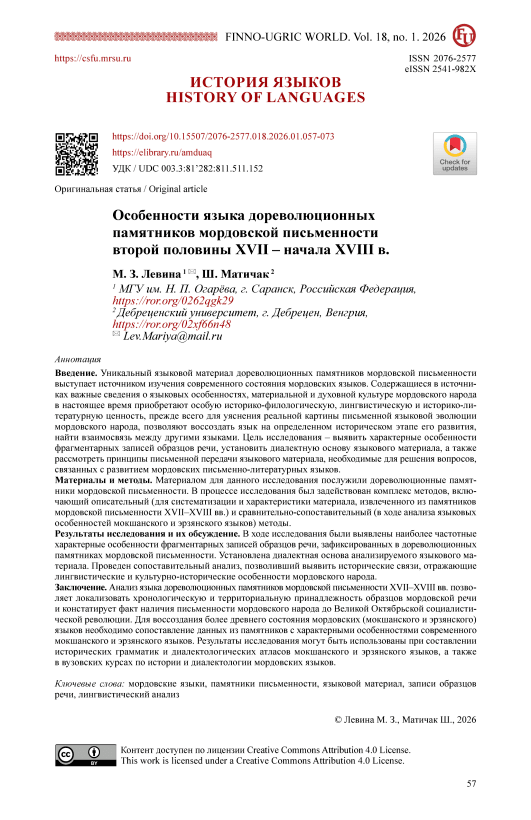 Introduction. The unique linguistic material preserved in pre-revolutionary monuments of Mordovian writing serves as a valuable source for studying the present state of the Mordovian languages. The sources contain important information on linguistic features as well as on the material and spiritual culture of the Mordovian people, which today acquires particular historical-philological, linguistic, and literary-historical significance. Above all, these materials contribute to clarifying the actual trajectory of the written linguistic evolution of the Mordovian people, enabling the reconstruction of the language at specific historical stages of its development and the identification of its interrelations with other languages. The aim of this study is to identify the characteristic features of fragmentary records of speech samples, to determine the dialectal basis of the linguistic material, and to examine the principles of its written representation, which are essential for addressing issues related to the development of Mordovian written literary languages. Materials and Methods. The material for this study comprises pre-revolutionary monuments of Mordovian written tradition. The research employs a set of methods, including the descriptive method (used to systematize and characterize the material extracted from Mordovian written sources of the 17th–18th centuries) and the comparative-contrastive method (applied in the analysis of linguistic features of the Moksha and Erzya languages). Results and Discussion. The study identified the most frequent characteristic features of fragmentary recordings of speech samples preserved in pre-revolutionary monuments of Mordovian writing. The dialectal basis of the analyzed linguistic material was established. A comparative analysis was conducted, making it possible to reveal historical connections that reflect the linguistic and cultural-historical characteristics of the Mordovian people. Conclusion. The analysis of the language of pre-revolutionary monuments of Mordovian written tradition from the 17th–18th centuries makes it possible to determine both the chronological and territorial attribution of the recorded samples of Mordovian speech, and to establish the existence of a written tradition among the Mordovian people prior to the Great October Socialist Revolution. In order to reconstruct earlier stages of the Mordovian languages (Moksha and Erzya), it is necessary to compare the data derived from these monuments with the characteristic features of the contemporary Moksha and Erzya languages. The results of this study may be employed in the compilation of historical grammars and dialectological atlases of the Moksha and Erzya languages, as well as in university-level courses on the history and dialectology of the Mordovian languages.