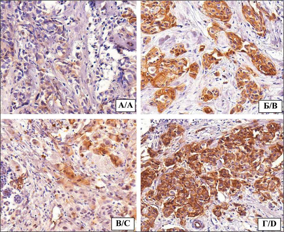 Рис. 1. Микрофото. Экспрессия субъединиц интегринов в первичной опухоли: А – цитоплазматическая экспрессия субъединицы интегрина αV (CD51); Б – цитоплазматическая/ мембранная колокализация экспрессии субъединцы интегрина αV (CD51); В – цитоплазматическая экспрессия субъединицы интегрина β3 (CD61); Г – цитоплазматическая/ мембранная колокализация экспрессии суьъединицы интегрина β3 (CD61); ×400. Примечание: рисунок выполнен авторами Fig. 1. Microphoto. Expression of integ-rin subunits in the primary tumor: A – cytoplasmic expression of the integrin subunit αV (CD51);