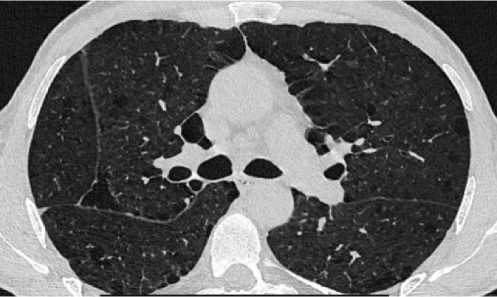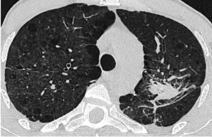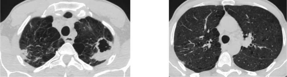 При проведении МСКТ ОГК-В S1 и S2 левого лёгкого субплеврально определяется воздушная полость неправильной формы с толстыми неровными стенками, до 3,5 см в диаметре, небольшим количеством патологического содержимого вдоль стенок. Вдоль заднего контура полости определяется крупная перифокальная зона консолидации, частично сливающаяся со стенкой полости, содержащая в толще единичные мелкие воздушные полости и единичные мелкие кальцинаты. К полости подходят отдельные субсегментарные бронхи, заполненные патологическим содержимым. В апикальных отделах S1 правого лёгкого, субплеврально определяются участки консолидации, с видимыми просветами субсегментарных бронхов – соответствует воспалительным изменениям. В обоих лёгких, в том числе вдоль междолевой плевры, определяются многочисленные мелкие очаги. Отмечаются выраженные эмфизематозные изменения обоих лёгких в виде парасептальной и буллёзной эмфиземы (рис. 1).