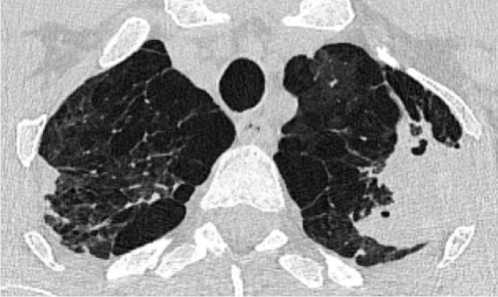 Figure 5. Axial CT scans of the chest organs, pulmonary window: a – the left lung is reduced in volume due to surgical treatment. In the basal zone, chains of metal sutures are traced against the background of a thickened interlobular interstitium; b – against the background of pronounced fibrous and bullous-dystrophic changes, multiple small foci are visualized along the interlobular pleura of both lungs