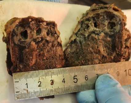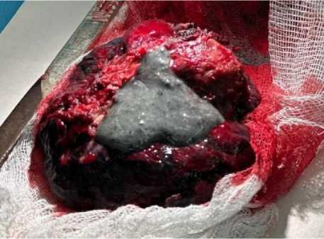 Figure 3. Macro-preparation of the surgical material: a – from the operating room after removal; б – cutting of the material for paraffin blocks: fragments of light size with the presence of a dense grayish focus with blackish areas on the incisions, as well as small blackish-gray foci, and, in addition, bullae