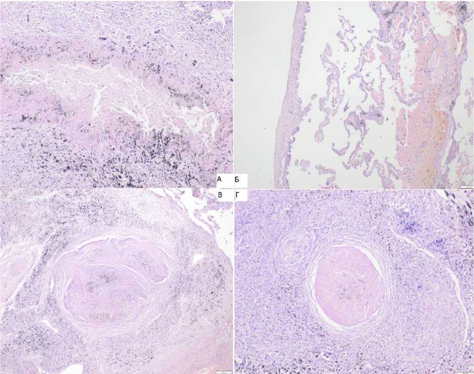 Figure 4. Pathohistological examination: А. Encapsulated focus of loose eosinophilic necrosis in the lung. There are deposits of charcoal pigment in the capsule and necrotic masses. Staining with hematoxylin and eosin. Magnification ×40. Б. Bullous emphysema of the lung. Staining with hematoxylin and eosin. Magnification ×40. В. Coniotic lesion in the lung. Staining with hematoxylin and eosin. Magnification ×100. Г. Conio-sis of the intrapulmonary lymph node. Staining with hematoxylin and eosin. Magnification ×100