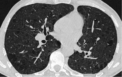 Рисунок 1. Аксиальные срезы КТ органов грудной клетки, легочное окно: а – S1 и S2 левого лёгкого, субплеврально определяется воздушная полость неправильной формы с толстыми неровными стенками; б – в обоих лёгких определяются многочисленные мелкие очаги, выраженные эмфизематозные изменения обоих лёгких в виде эмфиземы