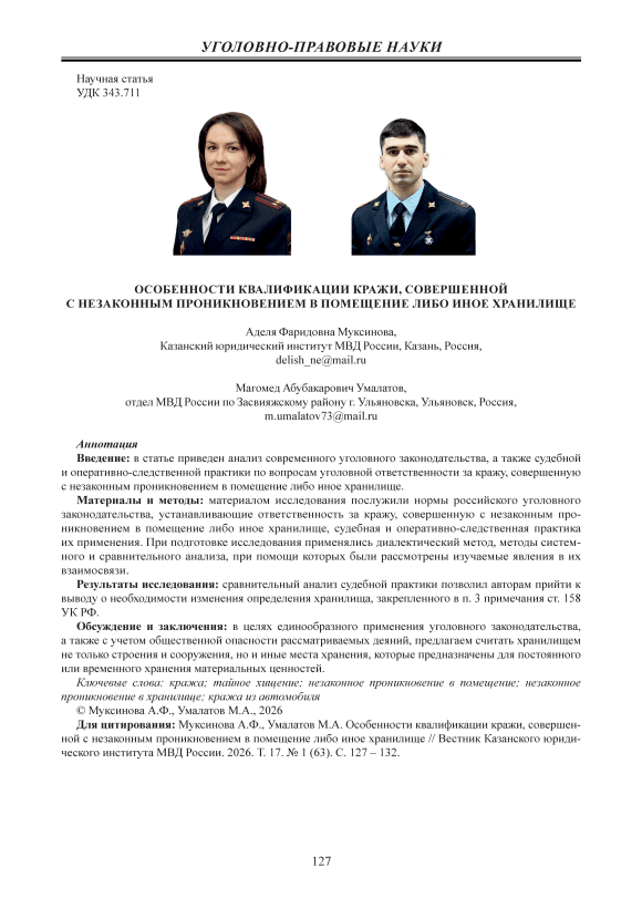 Текст научной статьи Особенности квалификации кражи, совершенной с незаконным проникновением в помещение либо иное хранилище