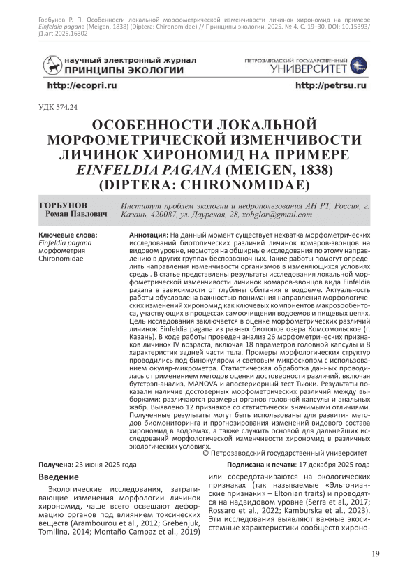 На данный момент существует нехватка морфометрических исследований биотопических различий личинок комаров-звонцов на видовом уровне, несмотря на обширные исследования по этому направлению в других группах беспозвоночных. Такие работы помогут определить направления изменчивости организмов в изменяющихся условиях среды. В статье представлены результаты исследования локальной морфометрической изменчивости личинок комаров-звонцов вида Einfeldia pagana в зависимости от глубины обитания в водоеме. Актуальность работы обусловлена важностью понимания направления морфологических изменений хирономид как ключевых компонентов макрозообентоса, участвующих в процессах самоочищения водоемов и пищевых цепях. Цель исследования заключается в оценке морфометрических различий личинок Einfeldia pagana из разных биотопов озера Комсомольское (г. Казань). В ходе работы проведен анализ 26 морфометрических признаков личинок IV возраста, включая 18 параметров головной капсулы и 8 характеристик задней части тела. Промеры морфологических структур проводились под бинокуляром и световым микроскопом с использованием окуляр-микрометра. Статистическая обработка данных проводилась с применением методов оценки достоверности различий, включая бутстрэп-анализ, MANOVA и апостериорный тест Тьюки. Результаты показали наличие достоверных морфометрических различий между выборками: различаются размеры органов головной капсулы и анальных жабр. Выявлено 12 признаков со статистически значимыми отличиями. Полученные результаты могут быть использованы для развития методов биомониторинга и прогнозирования изменений видового состава хирономид в водоемах, а также служить основой для дальнейших исследований морфологической изменчивости хирономид в различных экологических условиях.
