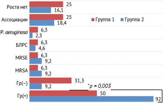 Среди грамположительных бактерий MRSA ( англ .: methicillin-resistant staphylococcus aureus ), MRSE ( англ .: methicillin-resistant staphylococcus epidermidis ), MRSH ( англ .: methicillin-resistant staphylococcus hominis ) встречали в 18 (20,7 %) изолятах (два изолята (11,1 %) — в группе 1, 16 (88,9 %) — в группе 2). В структуре грамотрицательных бактерий БЛРС+ встречали в 16 (25 %) исследованиях (два (12,5 %) — в группе 1, 14 (87,5 %) — в группе 2 соответственно).