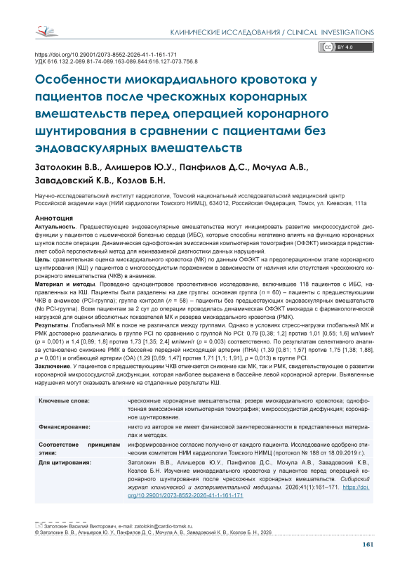 Актуальность. Предшествующие эндоваскулярные вмешательства могут инициировать развитие микрососудистой дисфункции у пациентов с ишемической болезнью сердца (ИБС), которые способны негативно влиять на функцию коронарных шунтов после операции. Динамическая однофотонная эмиссионная компьютерная томография (ОФЭКТ) миокарда представляет собой перспективный метод для неинвазивной диагностики данных нарушений. Цель: сравнительная оценка миокардиального кровотока (МК) по данным ОФЭКТ на предоперационном этапе коронарного шунтирования (КШ) у пациентов с многососудистым поражением в зависимости от наличия или отсутствия чрескожного коронарного вмешательства (ЧКВ) в анамнезе. Материал и методы. Проведено одноцентровое проспективное исследование, включившее 118 пациентов с ИБС, направленных на КШ. Пациенты были разделены на две группы: основная группа (n = 60) – пациенты с предшествующими ЧКВ в анамнезе (PCI-группа); группа контроля (n = 58) – пациенты без предшествующих эндоваскулярных вмешательств (No PCI-группа). Всем пациентам за 2 сут до операции проводилась динамическая ОФЭКТ миокарда с фармакологической нагрузкой для оценки абсолютных показателей МК и резерва миокардального кровотока (РМК). Результаты. Глобальный МК в покое не различался между группами. Однако в условиях стресс-нагрузки глобальный МК и РМК достоверно различались в группе PCI по сравнению с группой No PCI: 0,79 [0,38; 1,2] против 1,01 [0,55; 1,6] мл/мин/г (p = 0,001) и 1,4 [0,89; 1,8] против 1,73 [1,35; 2,4] мл/мин/г (p = 0,003) соответственно. По результатам селективного анализа установлено снижение РМК в бассейне передней нисходящей артерии (ПНА) (1,39 [0,81; 1,57] против 1,75 [1,38; 1,88], p = 0,001) и огибающей артерии (ОА) (1,29 [0,69; 1,47] против 1,71 [1,1; 1,91], p = 0,013) в группе PCI. Заключение. У пациентов с предшествующими ЧКВ отмечается снижение как МК, так и РМК, свидетельствующее о развитии коронарной микрососудистой дисфункции, которая наиболее выражена в бассейне левой коронарной артерии. Выявленные нарушения могут оказывать влияние на отдаленные результаты КШ.