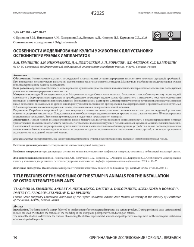 Обоснование. Формирование культи с последующей имплантацией остеоинтегрируемых имплантатов является серьезной проблемой. При проведении доклинических испытаний используются различные животные модели. Мы изучили особенности моделирования культи и послеоперационное ведение на кроликах. Цель работы: определить особенности моделирования культи экспериментальных животных и послеоперационное ведение для последующей установки остеоинтегрируемых имплантатов. Материалы и методы. В исследование вошли 14 кроликов породы Советская шиншилла. Выполняли транстибиальную ампутацию задней конечности с формированием переднего и преобладающего по размеру заднего кожно-фасциального и мышечного лоскутов; остеотомию проводили осциллирующей пилой с охлаждением физиологическим раствором. Самонарезающую втулку устанавливали в костномозговой канал винтовыми движениями до уровня опила; рану ушивали послойно без дренирования. Нами разработана и применена индивидуальная 3D-моделированная иммобилизирующая гильза, устанавливаемая поверх асептической повязки. Результаты. Разработан подробный протокол операции и этапы послеоперационного ведения животных для последующей установки остеоинтегрируемых имплантатов. Предложена новая иммобилизующая заднюю конечность кролика гильза с использованием 3D-моделирования и аддитивных технологий. Выявлены преимущества и недостатки предложенной методики. Заключение. Новый подход к моделированию кожно-мышечных лоскутов позволяет минимизировать в послеоперационном периоде травматизацию тканей и снизить частоту некрозов. Изготовление иммобилизирующей гильзы защищает культю от механических повреждений. Накопленный нами опыт формирования культи, изготовления имплантатов и иммобилизирующих устройств, а также послеоперационного ведения может быть применен в доклинических исследованиях для тестирования новых материалов и конструкций, а также для проведения экспериментов на крупной животной модели.