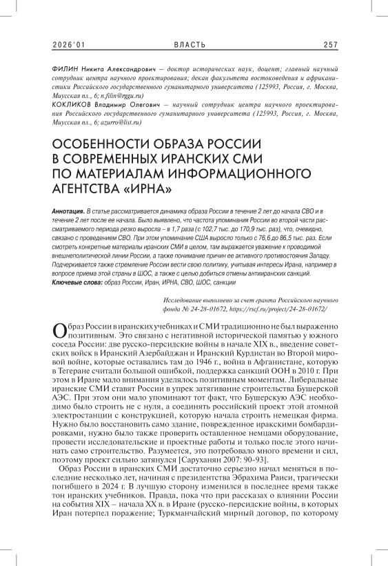 The article examines the dynamics of Russia's image over the two years before the start of the Special Military Operation and over the two years after its beginning. It was found that the frequency of mentioning Russia in the second part of the period under consideration increased sharply – by 1.7 times (from 102.7 thousand to 170.9 thousand times), which is obviously connected with the Special Military Operation, while the mentioning of the USA increased only from 76.6 to 86.5 thousand times. If we look at the specific material of the Iranian media in general, they express respect for the foreign policy line pursued by Russia, as well as understanding of the reasons for its active confrontation with the West. The authors also note that Russia tried to conduct its policy taking into account Iran's interests, for example, on the issue of Iran's admission to the Special Military Operation, as well as with the aim of achieving the lifting of anti-Iranian sanctions.