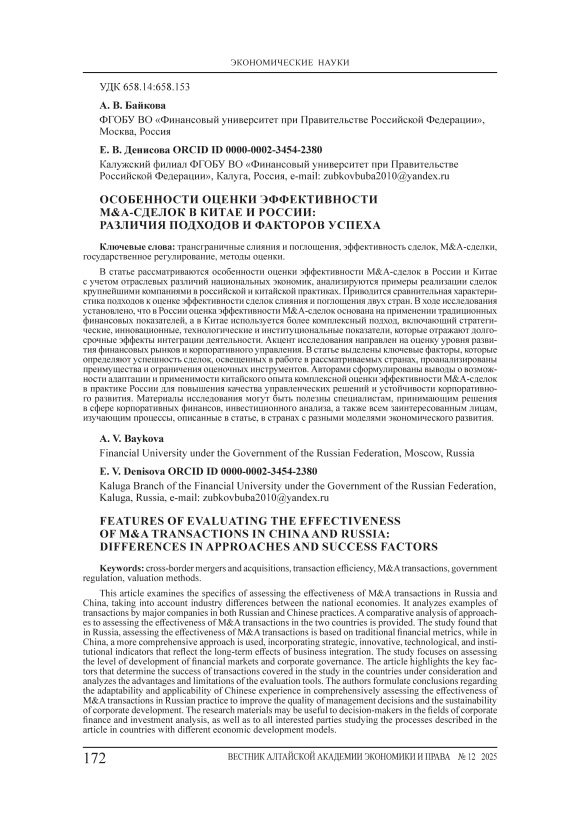 В статье рассматриваются особенности оценки эффективности M&A-сделок в России и Китае с учетом отраслевых различий национальных экономик, анализируются примеры реализации сделок крупнейшими компаниями в российской и китайской практиках. Приводится сравнительная характеристика подходов к оценке эффективности сделок слияния и поглощения двух стран. В ходе исследования установлено, что в России оценка эффективности M&A-сделок основана на применении традиционных финансовых показателей, а в Китае используется более комплексный подход, включающий стратегические, инновационные, технологические и институциональные показатели, которые отражают долгосрочные эффекты интеграции деятельности. Акцент исследования направлен на оценку уровня развития финансовых рынков и корпоративного управления. В статье выделены ключевые факторы, которые определяют успешность сделок, освещенных в работе в рассматриваемых странах, проанализированы преимущества и ограничения оценочных инструментов. Авторами сформулированы выводы о возможности адаптации и применимости китайского опыта комплексной оценки эффективности M&A-сделок в практике России для повышения качества управленческих решений и устойчивости корпоративного развития. Материалы исследования могут быть полезны специалистам, принимающим решения в сфере корпоративных финансов, инвестиционного анализа, а также всем заинтересованным лицам, изучающим процессы, описанные в статье, в странах с разными моделями экономического развития.
