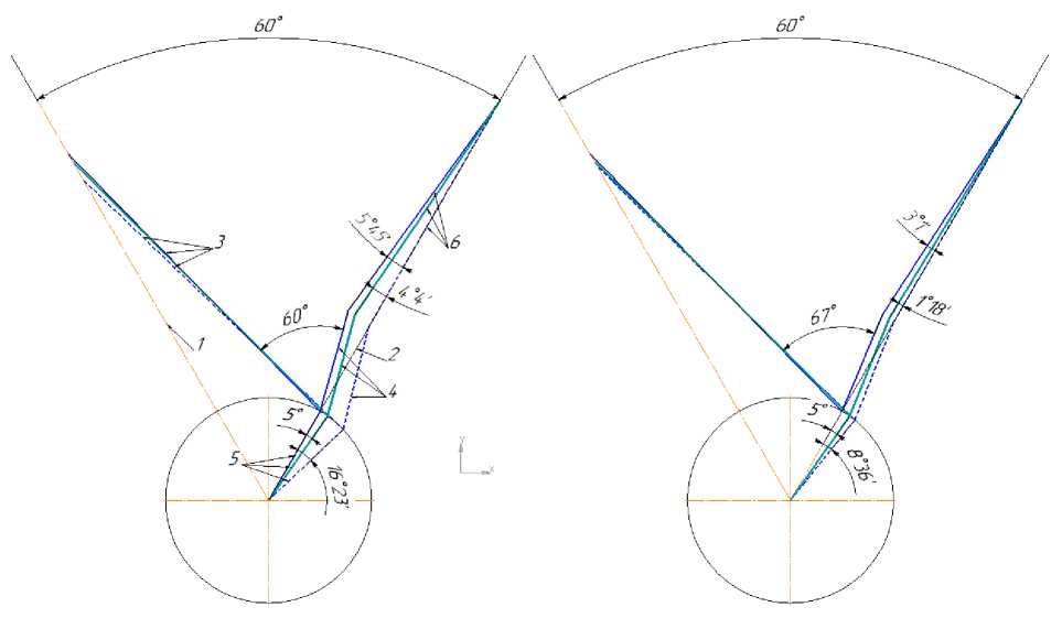 На рис. 1 представлены кинематические схемы с указанием значений углов между продольными осями (6) прицепного шатуна и осью бокового цилиндра (2) при использовании конструкций главного шатуна, выполненных по первой схеме (рис. 1а) и по второй схеме (рис. 1б).