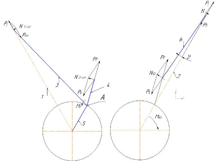 Кроме этого, вектор суммарной силы Pz, действующий под углом γ относительно оси шатунной шейки А, будет оказывать негативное влияние на сопряжения шатунной шейки до тех пор, пока ось прицепного шатуна не пересечет ось бокового цилиндра.