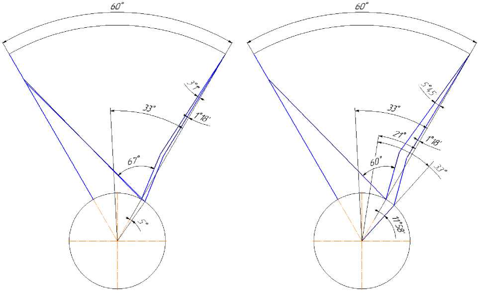 В качестве эталона по организации рабочего процесса при двухфазном впрыске топлива целесообразно использовать для двигателей типа В-2 принятый на производстве угол опережения впрыска топлива, равный 33 град. ПКВ до ВМТ. На рис. 3а представлена схема организации подачи топлива двигателя типа В-2 серийной комплектации и показано, что при положении поршня бокового цилиндра в ВМТ угол отклонения оси прицепного шатуна относительно оси бокового цилиндра составляет 3°1 ′ до момента совпадения расположения их осей. При повороте кривошипа на 5 град. ПКВ этот угол равен 1°18 ′ .