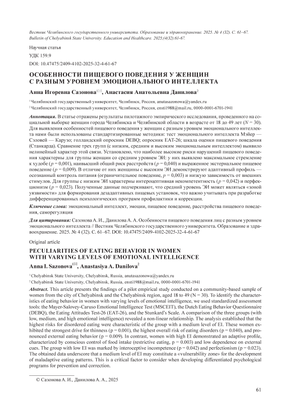В статье отражены результаты пилотажного эмпирического исследования, проведенного на социальной выборке женщин города Челябинска и Челябинской области в возрасте от 18 до 49 лет (N = 30). Для выявления особенностей пищевого поведения у женщин с разным уровнем эмоционального интеллекта нами были использованы стандартизированные методики: тест эмоционального интеллекта Мэйер — Сэловей — Карузо; голландский опросник DEBQ; опросник EAT-26; шкала оценки пищевого поведения (Станкарда). Сравнение трех групп (с низким, средним и высоким эмоциональным интеллектом) выявило нелинейный характер этой связи. Установлено, что наиболее высокие риски нарушений пищевого поведения характерны для группы женщин со средним уровнем ЭИ: у них выявлено максимальное стремление к худобе (p = 0,001), наивысший общий риск расстройств (p = 0,040) и выраженное экстернальное пищевое поведение (p = 0,009). В отличие от них женщины с высоким ЭИ демонстрируют адаптивный профиль — осознанный контроль питания (ограничительное поведение, p = 0,003) и низкую зависимость от внешних стимулов. Для группы с низким ЭИ характерны интероцептивная некомпетентность (p = 0,042) и перфекционизм (p = 0,023). Полученные данные подчеркивают, что средний уровень ЭИ может являться «зоной уязвимости» для формирования дезадаптивных пищевых установок, что важно учитывать при разработке дифференцированных психологических программ профилактики и коррекции.